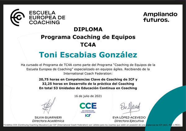 Acreditació internacional com a Asociate Certified Coach, otorgat per la ICF (International Coaching Federation).